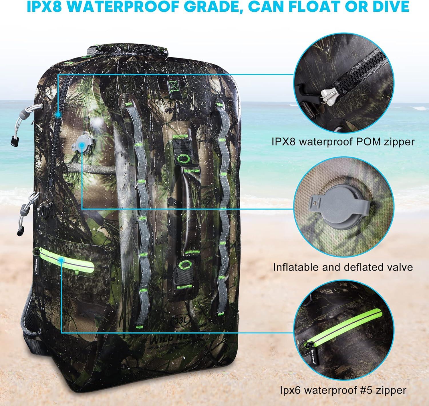 WILD HEART Waterproof and Airtight 33L Backpack with Rafting and Tracking Capabilities – Perfect for River Adventures(Army Green)